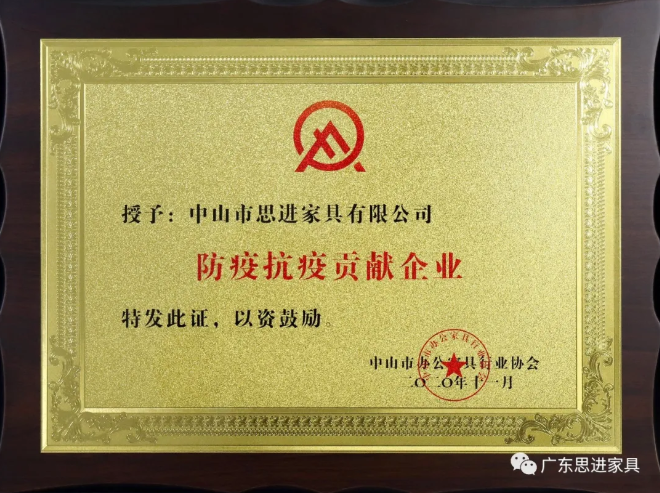 2020年一場新冠疫情突然襲來,打亂了我們生活與工作的節(jié)奏,雖然我們遇到了很多困難,但思進(jìn)家具一直秉承自己的企業(yè)愿景和核心價值觀:承擔(dān)社會責(zé)任,實(shí)現(xiàn)國富民強(qiáng)。思進(jìn)人齊心協(xié)力,向中山市紅十字會捐出10萬元作為抗疫善款,協(xié)會特授予思進(jìn)家具“防疫抗疫突出貢獻(xiàn)獎”。